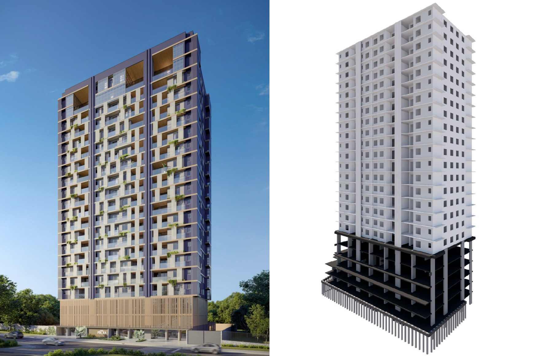 Nesse projeto, usamos parede de concreto nos pavimentos tipo, mas precisávamos vencer grandes vãos no pavimento de lazer, acima da garagem. A solução foi desenvolver vigas de transição e lajes protendidas compatibilizadas com todos os complementares — estrutura mista bem resolvida.